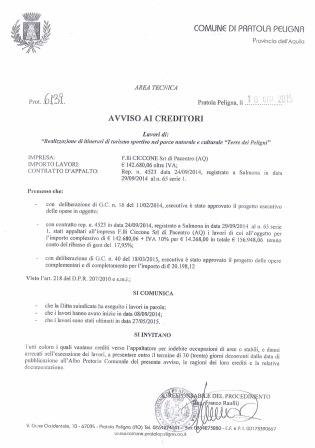 AVVISO AI CREDITORI: lavori di realizzazione di itinerari di turismo sportivo nel parco naturale e culturale "Terre dei Peligni"